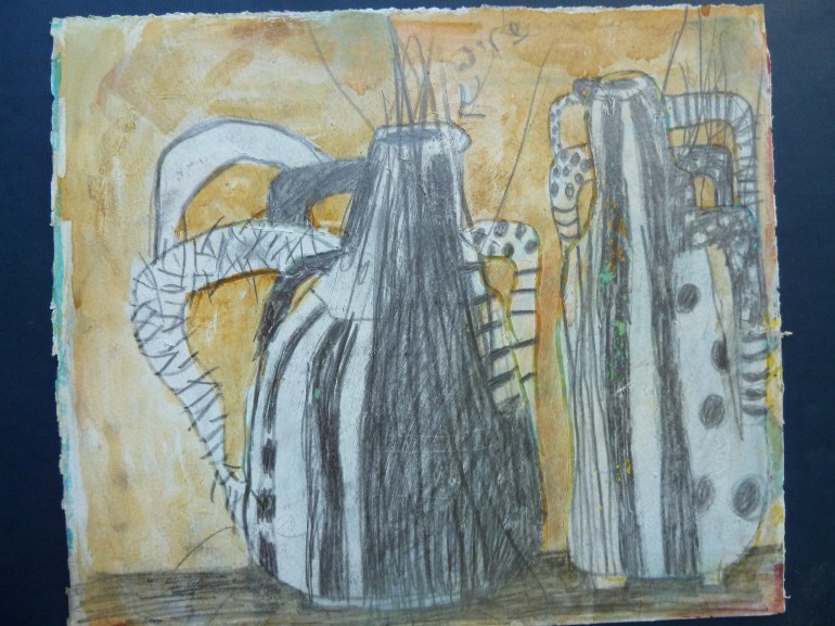 I like the still solidity of pot forms. But sometimes it’s good to just draw pots as I can animate the paper surface with a variety of marks. There is also an immediacy to drawing , [compared with making pots]. This group of drawings was made in 2015.